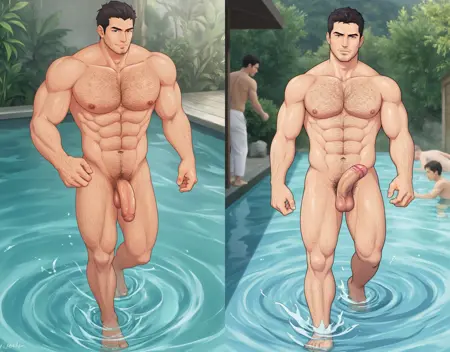 「penis」がスタイルタグで、続いて「a naked man」(これは重要なタグです)を使用。必要に応じて「erection」または「penis」と追加してください。