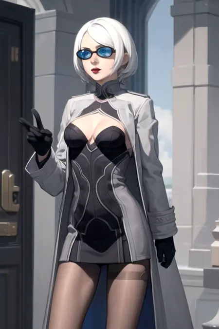 DoctusXeno, 1girl, solo, short hair, blue eyes, black gloves, cleavage, medium breasts, white hair, pantyhose, glasses, grey coat, cleavage cutout, sunglasses, lipstick