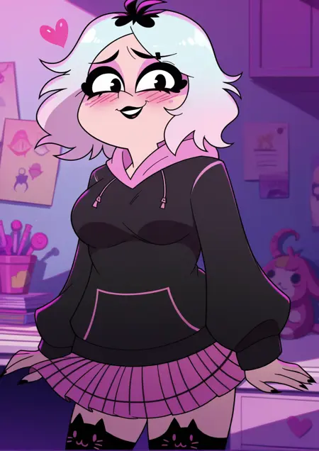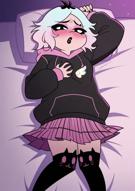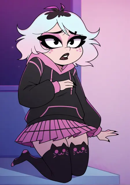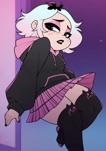 服装: 黑色连帽衫,粉红色帽兜,帽兜下垂,粉红色裙子,百褶裙,格子裙,迷你裙,过膝长袜,黑色袜子,动物耳朵腿饰,猫耳腿饰,无鞋