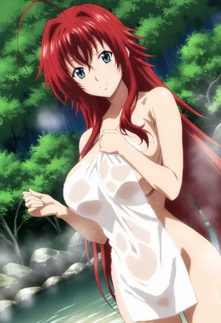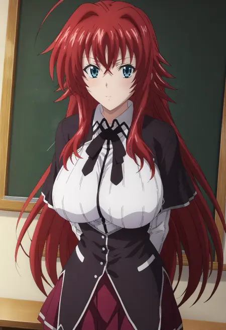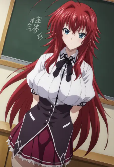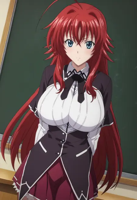 rias gremory, blue eyes, long hair, red hair, hair between eyes, ahoge, huge breasts