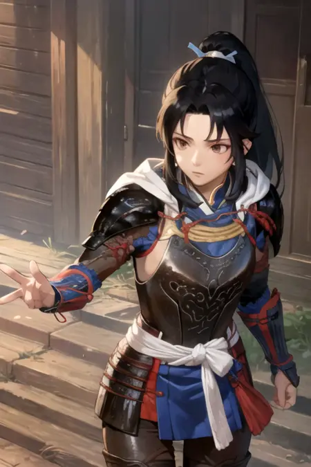 GinchiyoNioh, 1girl, solo, long hair, black hair, brown eyes, ponytail, blue cape, black armor, shoulder armor, japanese armor