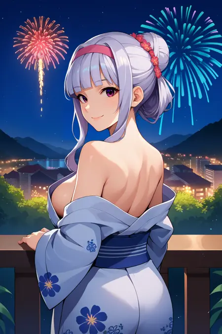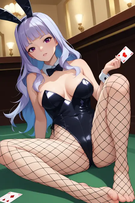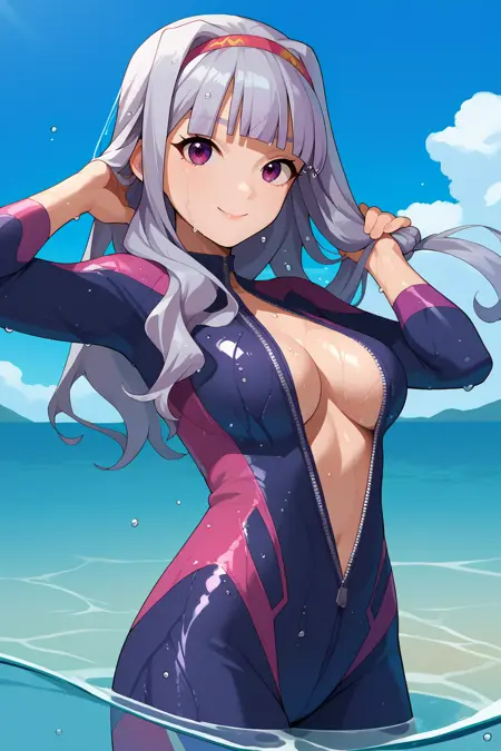외모: tknshj, 중간 크기 가슴, 둔한 앞머리, 머리카락 흐름, 헤어밴드, 긴 머리, 회색 머리, 보라색 눈
