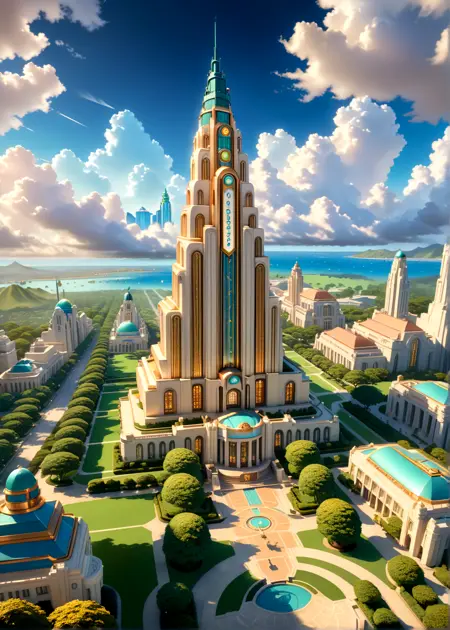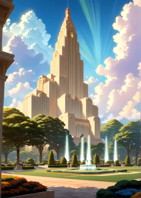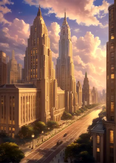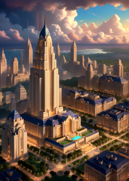 このモデルのプロンプトは、アールデコ、風景、建築物、都市、シティスケープ、建築、記念的な建築です。