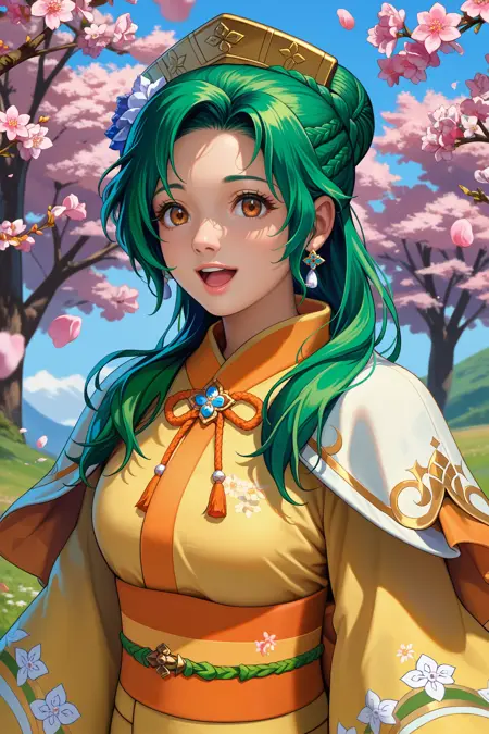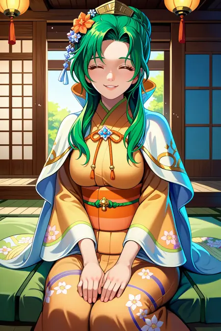 添加 "hsElincia, green hair, hair bun, long hair, braid, brown eyes, hair flower, hat, white capelet, orange kimono, sash, wide sleeves, floral print" 以获得星之岛夏日Elincia。