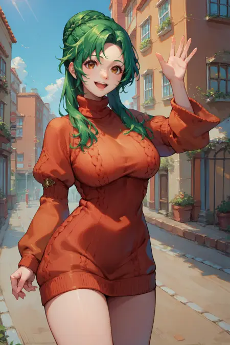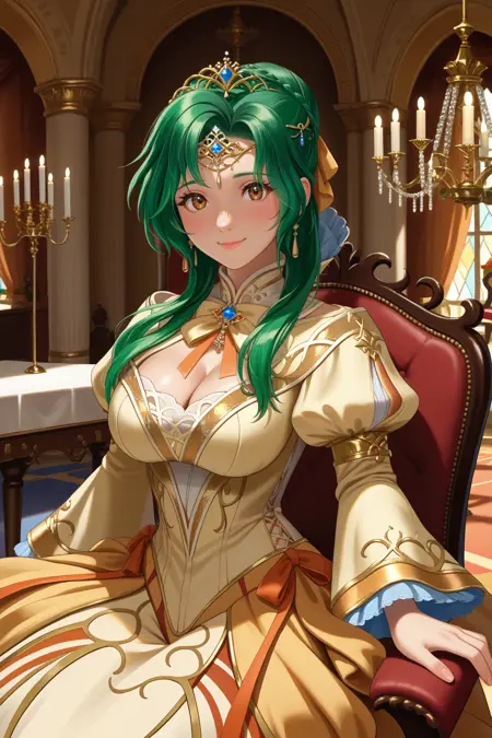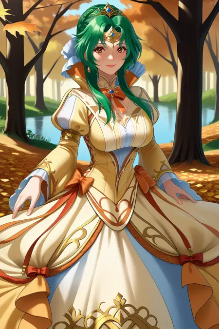 添加 "ogElincia, green hair, hair bun, long hair, braid, brown eyes, gold circlet, earrings, collarbone, orange dress, puffy sleeves, long sleeves, yellow skirt, large breasts" 以获得她的原版形象。