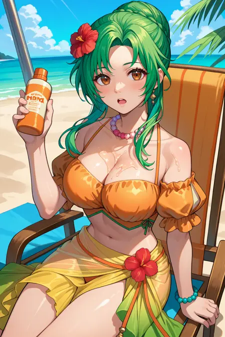 添加 "smrElincia, green hair, hair bun, long hair, braid, brown eyes, red flower, beads, bead necklace, bead bracelet, hair flower, off-shoulder bikini, orange bikini, puffy sleeves, cleavage, sarong, swimsuit" 以获得夏日Elincia。