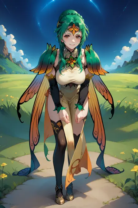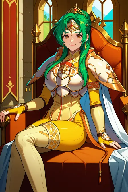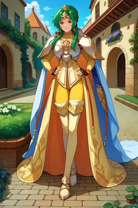 添加 "lgdElincia, green hair, hair bun, long hair, braid, brown eyes, gold tiara, crown, earrings, white cape, armored dress, white armor, gold trim, yellow pants, fingerless gloves, white thighhighs" 以获得传奇Elincia。