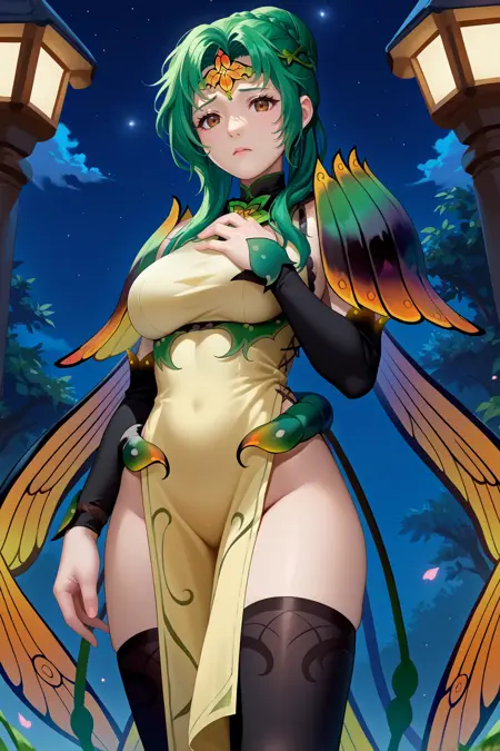 添加 "respElincia, green hair, hair bun, long hair, braid, brown eyes, black circlet, insect wings, shoulder pads, sleeveless dress, detached sleeves, black sleeves, pelvic curtain, black thighhighs" 以获得华美Elincia。