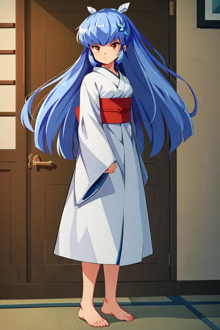 ➜ OyukiUYXL, 赤い目, 青い髪, 長い髪, 前髪, 横髪, 髪飾り, 小さな胸, 白い着物, 赤い帯, 裸足