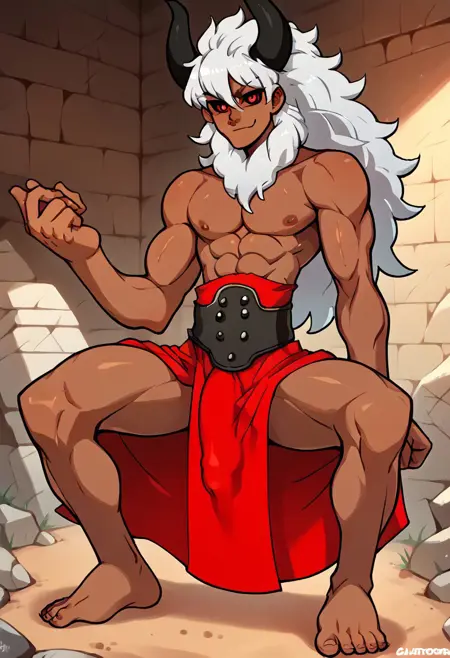 아스테리오스, 미노타우로스, 검은 피부, 뿔, 흰 머리, 긴 머리, 매우 긴 머리, 목 주변의 머리카락, 앞머리, 단일 땋은 머리, 두꺼운 눈썹, 붉은 눈, 색상이 있는 공막, 상반신 노출된 남성, 거대한 가슴, 매우 근육질, 거대한 유방, 거대한 유방, 큰 음경, 큰 가슴, 거대한 음경,복근, 넓은 어깨, 마른 체형, 스트랩 없는 드레스, 상의 없음, 맨발, 액세서리,