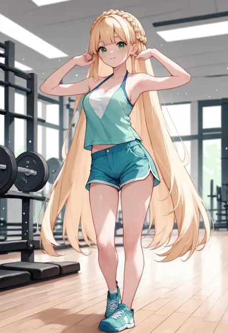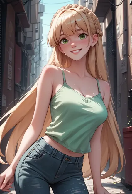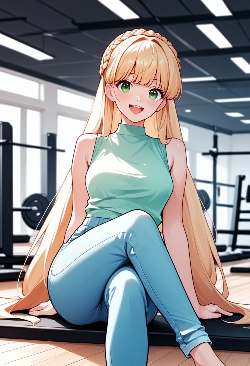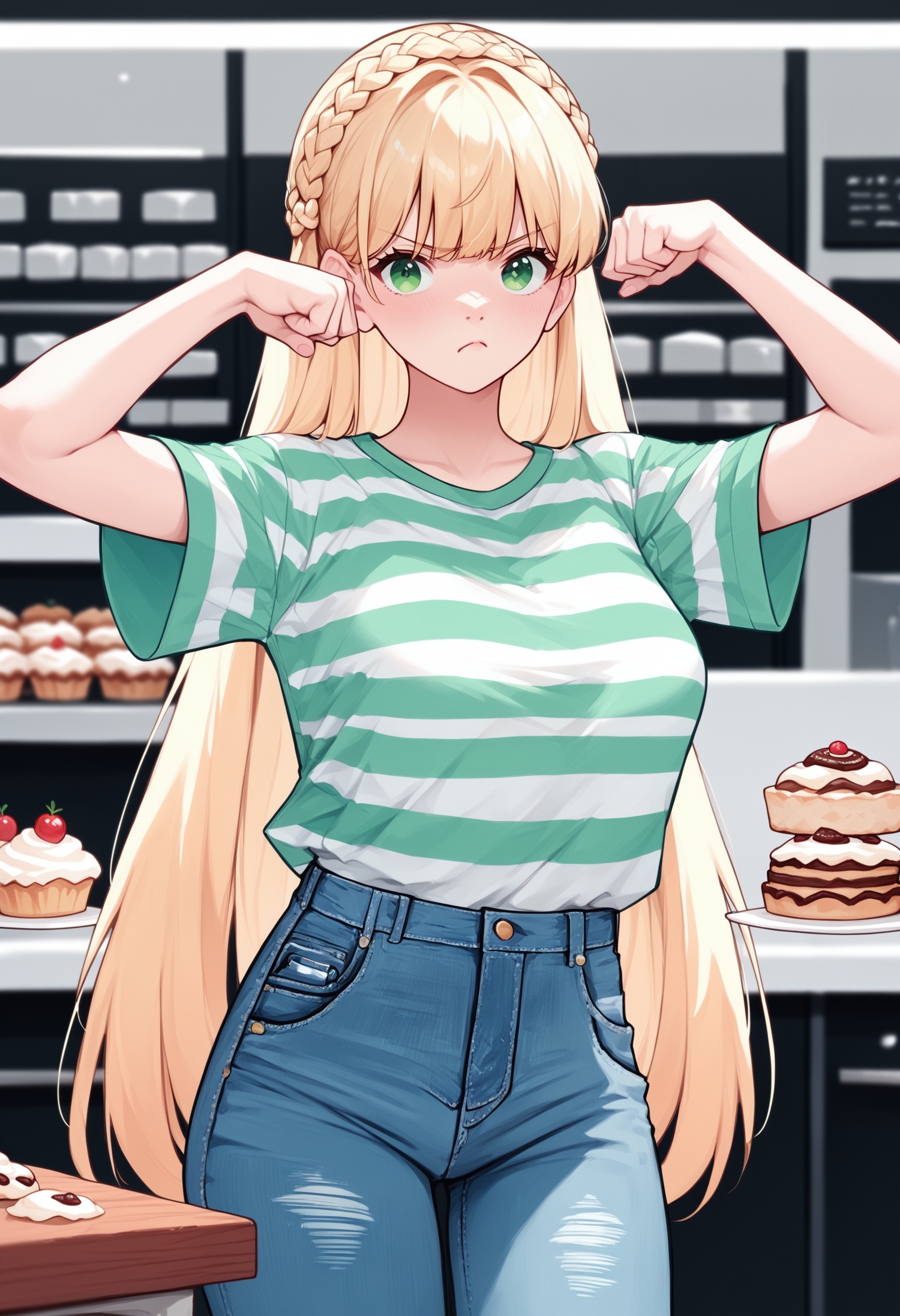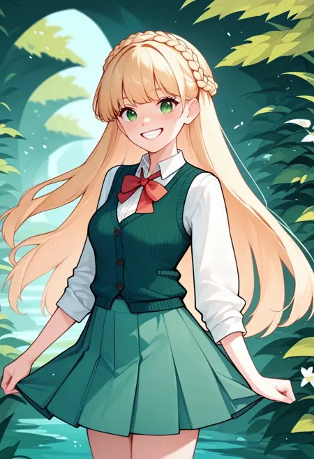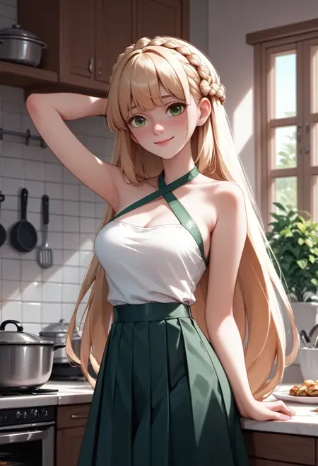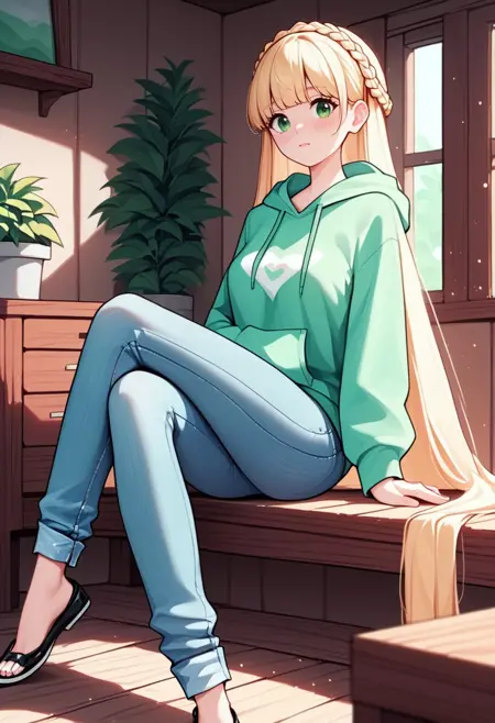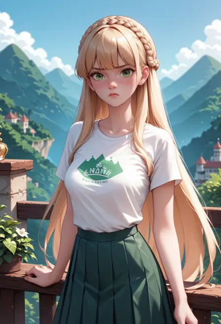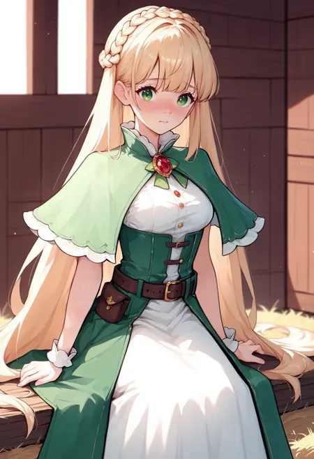 (正向提示词)celine, 长发, 金发, 编发王冠, 齐刘海, 绿眼睛,