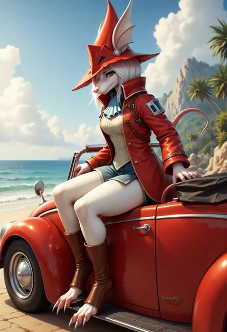 그녀가 고전적인 복장을 입고 있음을 보장하려면 '빨간 코트, 애스콧, 가죽 게이터, 드라곤 모자'를 사용하세요.