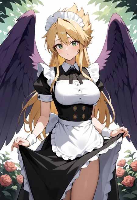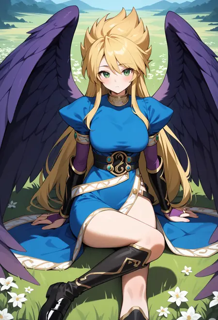 outfit1aanina, long hair, blonde hair, green eyes, large breasts, feathered wings, purple wings, blue dress, puffy sleeves, bridal gauntlets, side slit