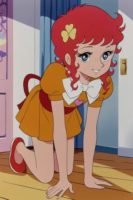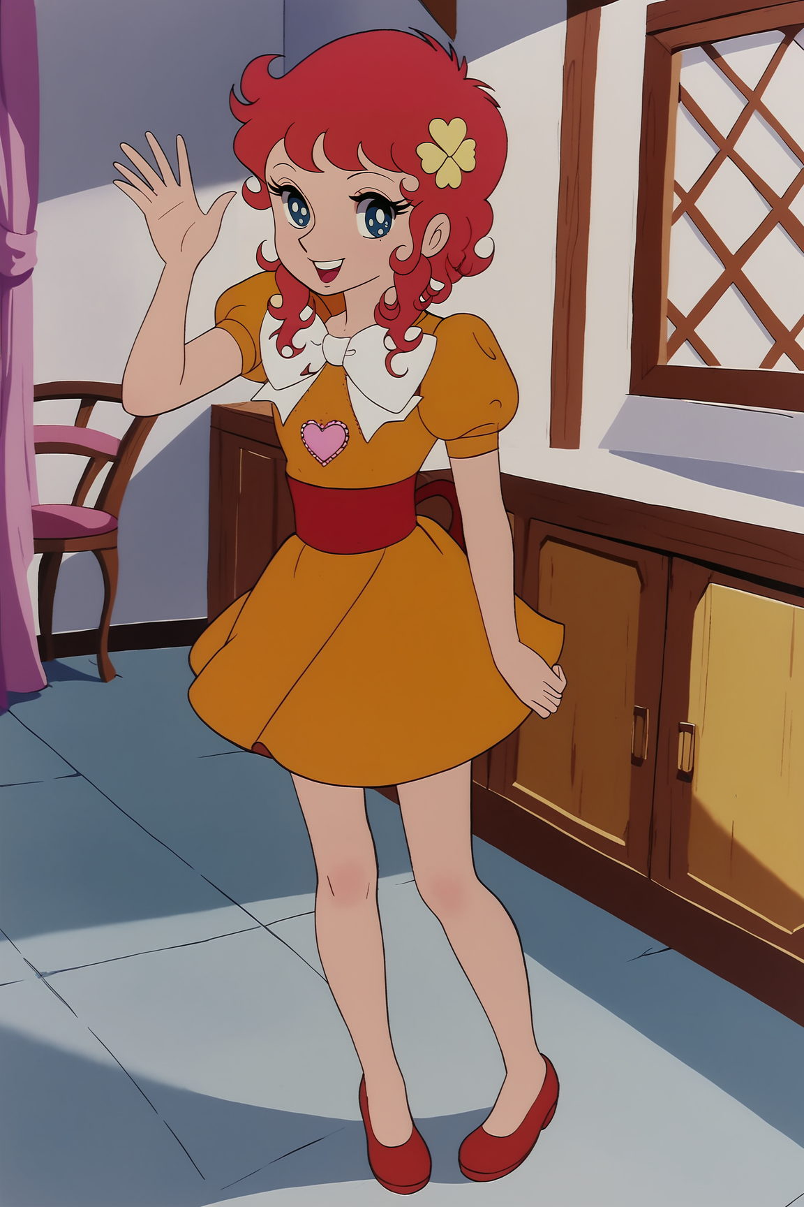 ➜ KMeguMMXL, レトロアートスタイル, 青い目, 赤髪, 短髪, 髪の装飾, カールした髪, 平らな胸, 白いリボン, ハートのブローチ, オレンジ色のドレス, 短い袖, フリル袖, 赤いサッシュリボン, オレンジ色のスカート, 赤い靴