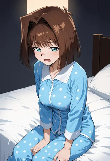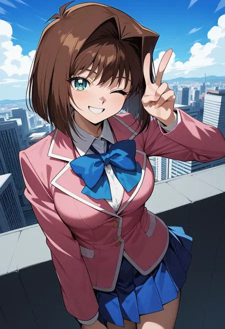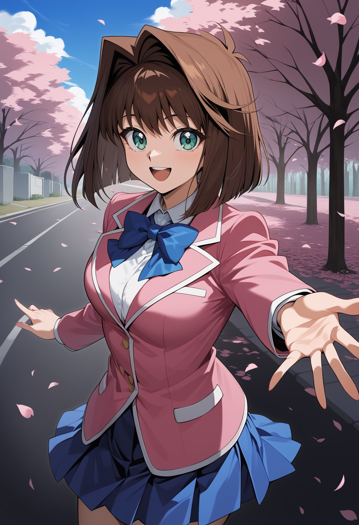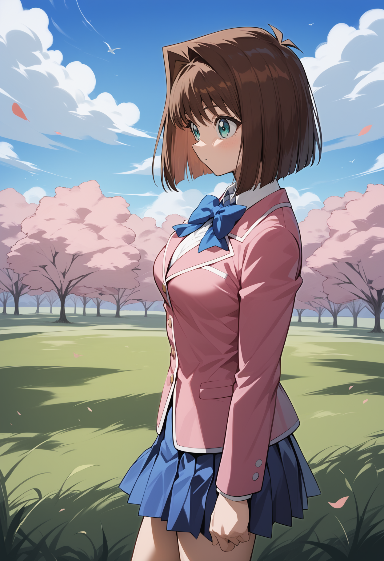 outfit1aaanzu, medium hair, brown hair, aqua eyes, breasts, school uniform, blue bowtie, blazer, pink jacket, long sleeves, pleated skirt, blue skirt