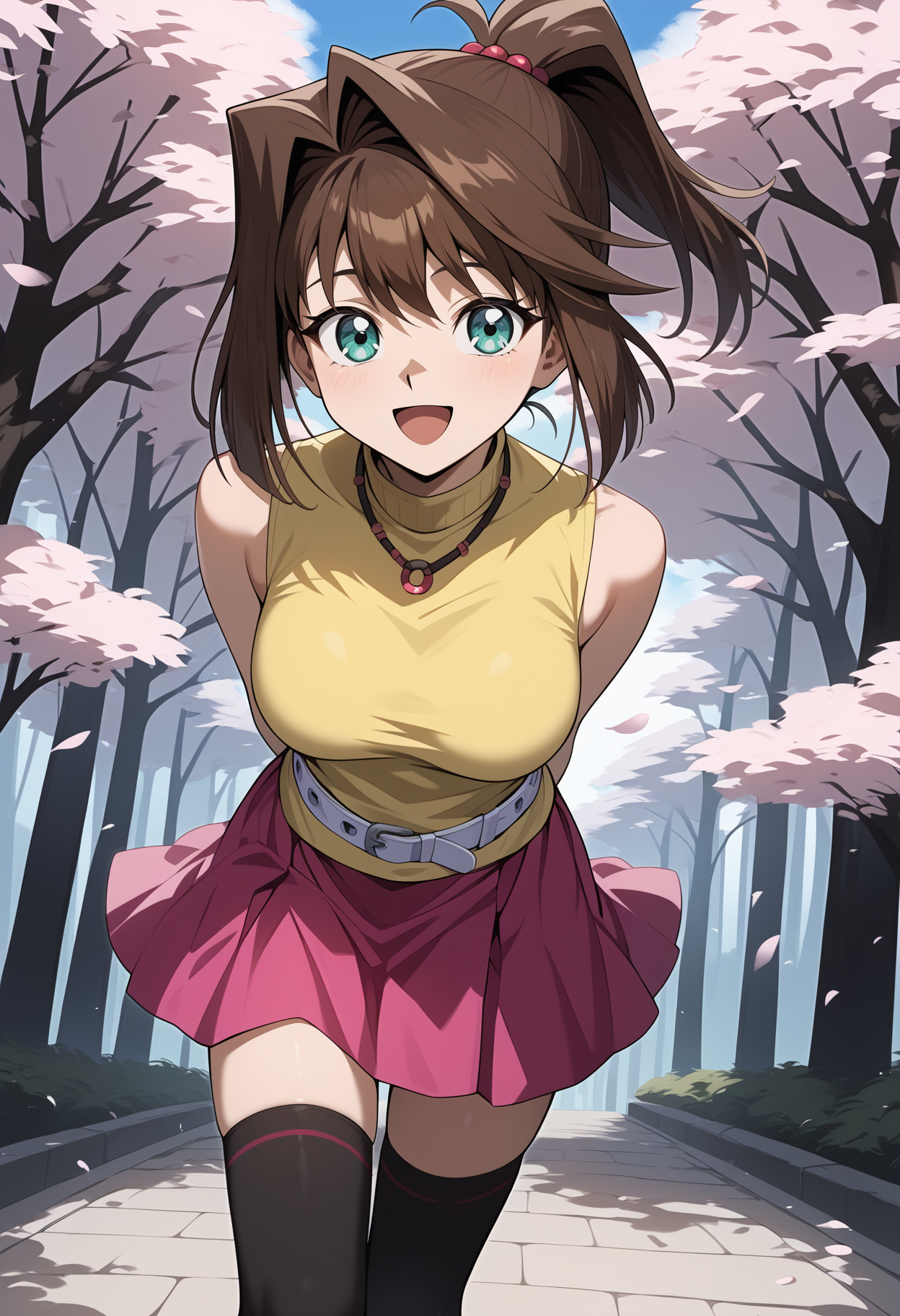 outfit2aaanzu, medium hair, brown hair, ponytail, aqua eyes, breasts, turtleneck, necklace, yellow shirt, sleeveless, bracelet, white belt, miniskirt, pink skirt, black thighhighs