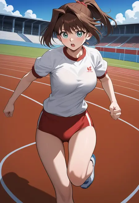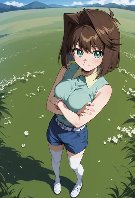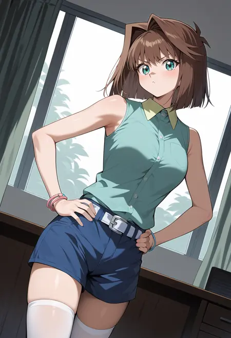 outfit3aaanzu, medium hair, brown hair, aqua eyes, breasts, collared shirt, green shirt, sleeveless, bracelet, short shorts, blue shorts, white belt, white thighhighs