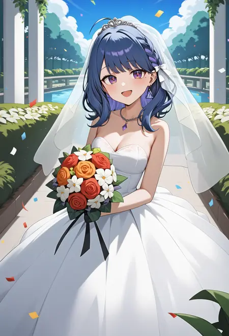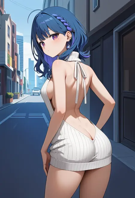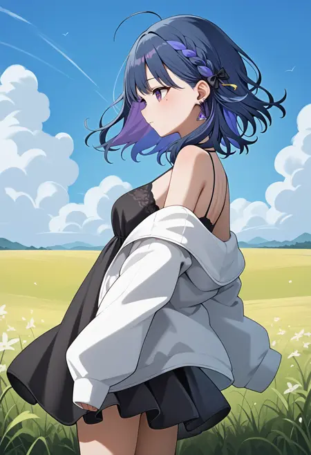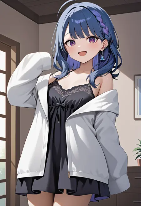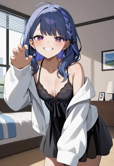 outfit2aatoru, medium hair, multicolored hair, blue hair, purple hair, ahoge, braid, earrings, purple eyes, diamond-shaped pupils, mole under eye, breasts, bare shoulders, lace trim, black dress, negligee, off shoulder, white jacket, long sleeves, sleeves past wrists