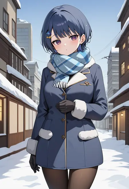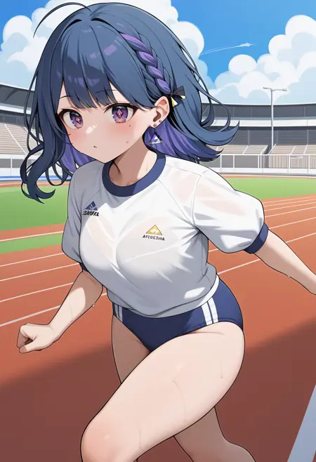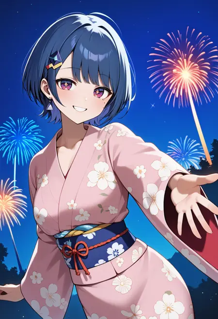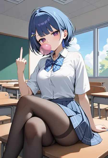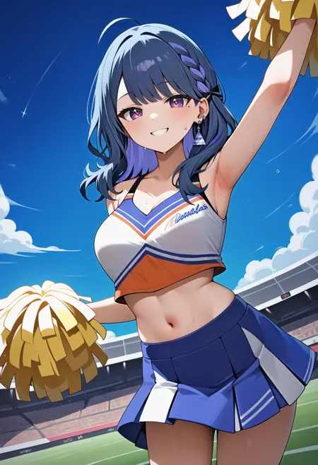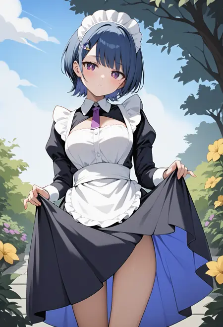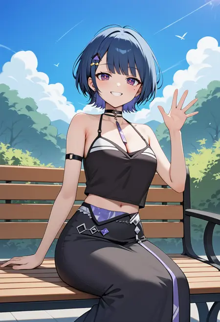 outfit1-1 (without jacket)aatoru, short hair, blue hair, hair ornament, purple eyes, diamond-shaped pupils, mole under eye, breasts, black choker, necklace, cleavage, black shirt, bare arms, arm strap, midriff, long skirt, black skirt