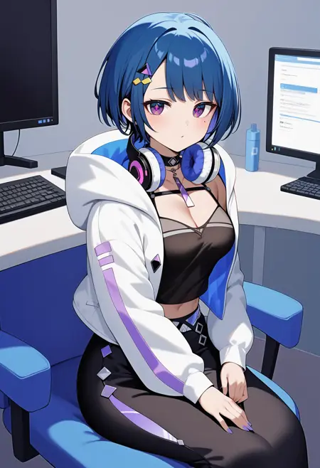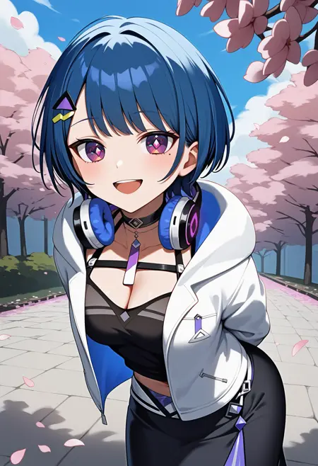 outfit1aatoru, short hair, blue hair, hair ornament, purple eyes, diamond-shaped pupils, mole under eye, headphones around neck, breasts, black choker, necklace, cleavage, black shirt, hooded jacket, white jacket, long sleeves, midriff, long skirt, black skirt