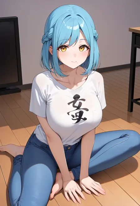 outfit2aamoira, medium hair, blue hair, braid, yellow eyes, mole under mouth, large breasts, collarbone, t-shirt, white shirt, short sleeves, clothes writing, denim, jeans, blue pants