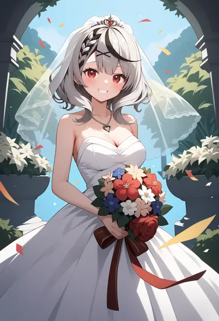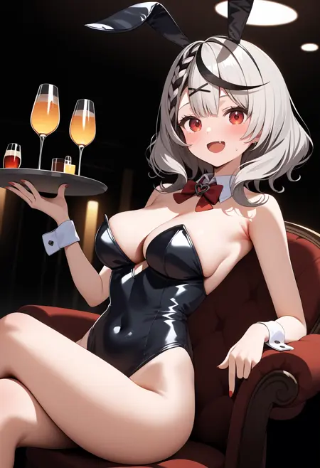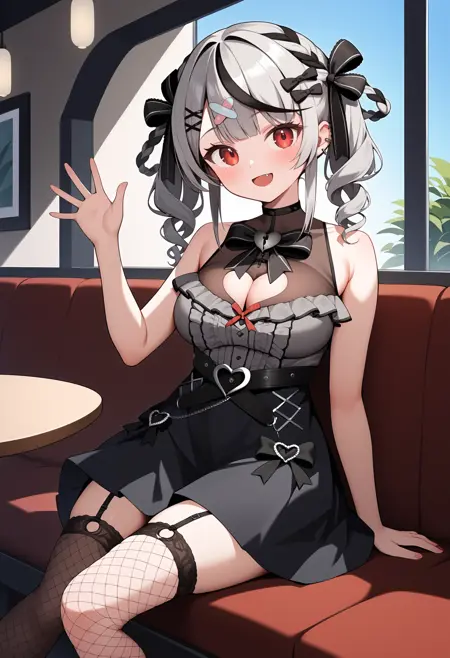 outfit6-2 (without jacket)ddchloe, streaked hair, grey hair, braid, twin drills, hair ribbon, hair bow, hairclip, hair ornament, bandaid, ear piercing, red eyes, breasts, bare shoulders, black bowtie, see-through, cleavage cutout, frilled shirt, grey shirt, sleeveless, bare arms, black belt, black skirt, garter straps, fishnet thighhighs, black thighhighs