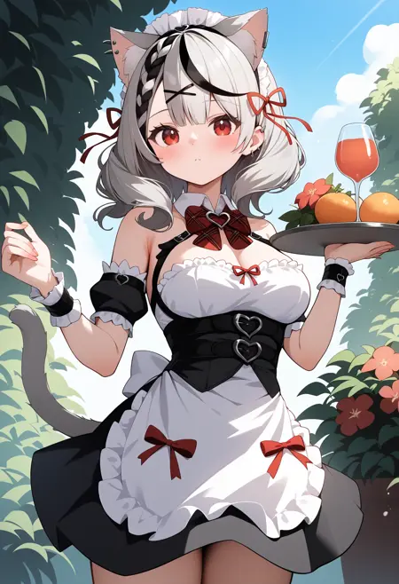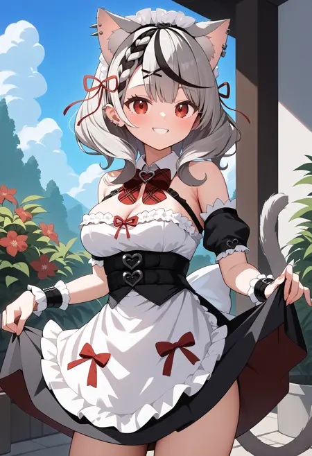 outfit4aachloe, medium hair, streaked hair, grey hair, animal ears, maid headdress, hair ribbon, x hair ornament, braided bangs, ear piercing, red eyes, breasts, cat tail, detached collar, red bowtie, harness, dress, underbust, detached sleeves, wrist cuffs, white apron, black skirt