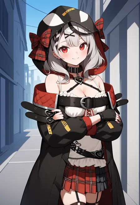 outfit1-2 (hood up, jacket)aachloe, medium hair, streaked hair, grey hair, hood up, red bow, x hair ornament, braided bangs, red eyes, breasts, black collar, harness, cleavage, belt bra, white camisole, black jacket, off shoulder, long sleeves, fingerless gloves, black gloves, black belt, plaid skirt, red skirt, garter straps, torn thighhighs, black thighhighs