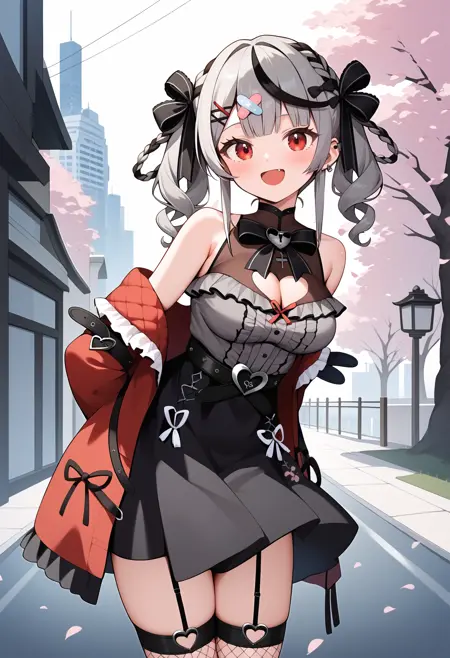 outfit6-1 (jacket)ddchloe, streaked hair, grey hair, braid, twin drills, hair ribbon, hair bow, hairclip, hair ornament, bandaid, ear piercing, red eyes, breasts, bare shoulders, black bowtie, see-through, cleavage cutout, frilled shirt, grey shirt, sleeveless, off shoulder, red jacket, long sleeves, black belt, black skirt, garter straps, fishnet thighhighs, black thighhighs