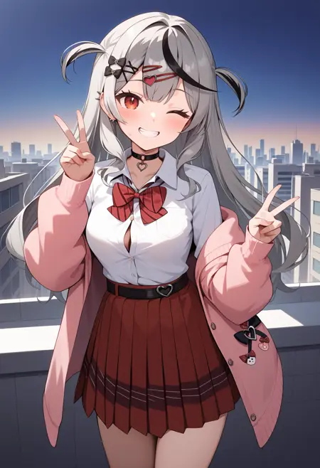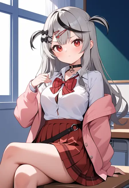 outfit5ccchloe, long hair, streaked hair, grey hair, two side up, hairclip, hair bow, hair ornament, red eyes, breasts, school uniform, black choker, red bowtie, collared shirt, white shirt, shirt tucked in, off shoulder, sweater, pink cardigan, long sleeves, loose belt, pleated skirt, red skirt