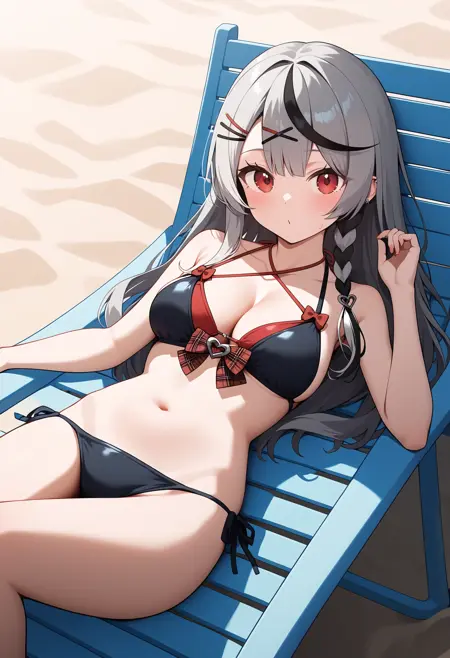 outfit3aachloe, long hair, streaked hair, grey hair, single braid, hairclip, x hair ornament, red eyes, breasts, halterneck, bare shoulders, cleavage, layered bikini, plaid bow, red bow, black bikini, side-tie bikini bottom
