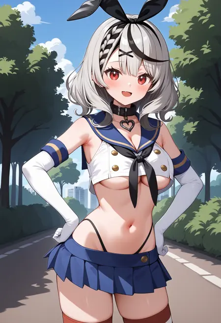 outfit7aachloe, medium hair, streaked hair, grey hair, black hairband, hair ribbon, x hair ornament, braided bangs, red eyes, breasts, cosplay, black collar, blue sailor collar, black neckerchief, cleavage, white shirt, underboob, sleeveless, elbow gloves, white gloves, midriff, microskirt, blue skirt, highleg panties, striped thighhighs