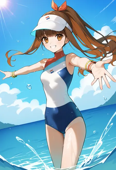 outfit3aahakuno, long hair, brown hair, ponytail, hair ribbon, visor cap, white headwear, brown eyes, breasts, one-piece swimsuit, sleeveless, bracelet