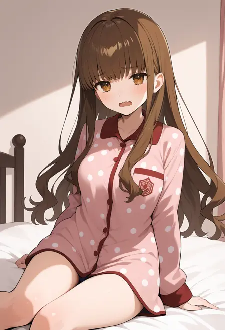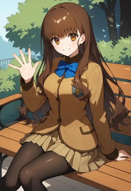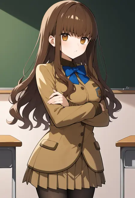 outfit1aahakuno, long hair, brown hair, brown eyes, breasts, school uniform, blue bowtie, brown jacket, long sleeves, pleated skirt, brown skirt, black pantyhose