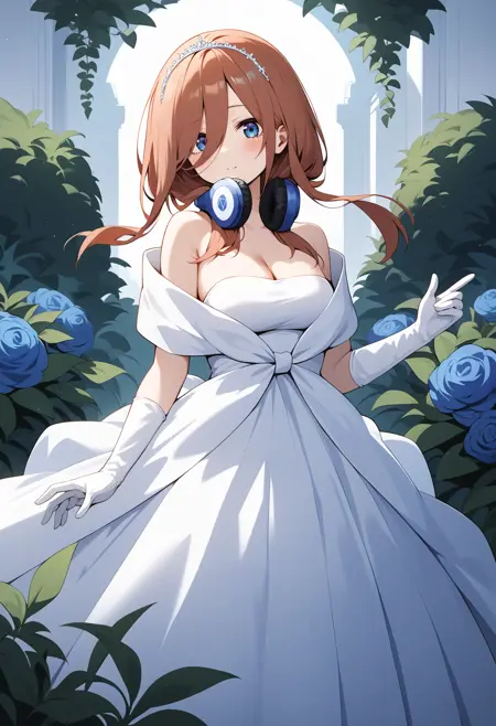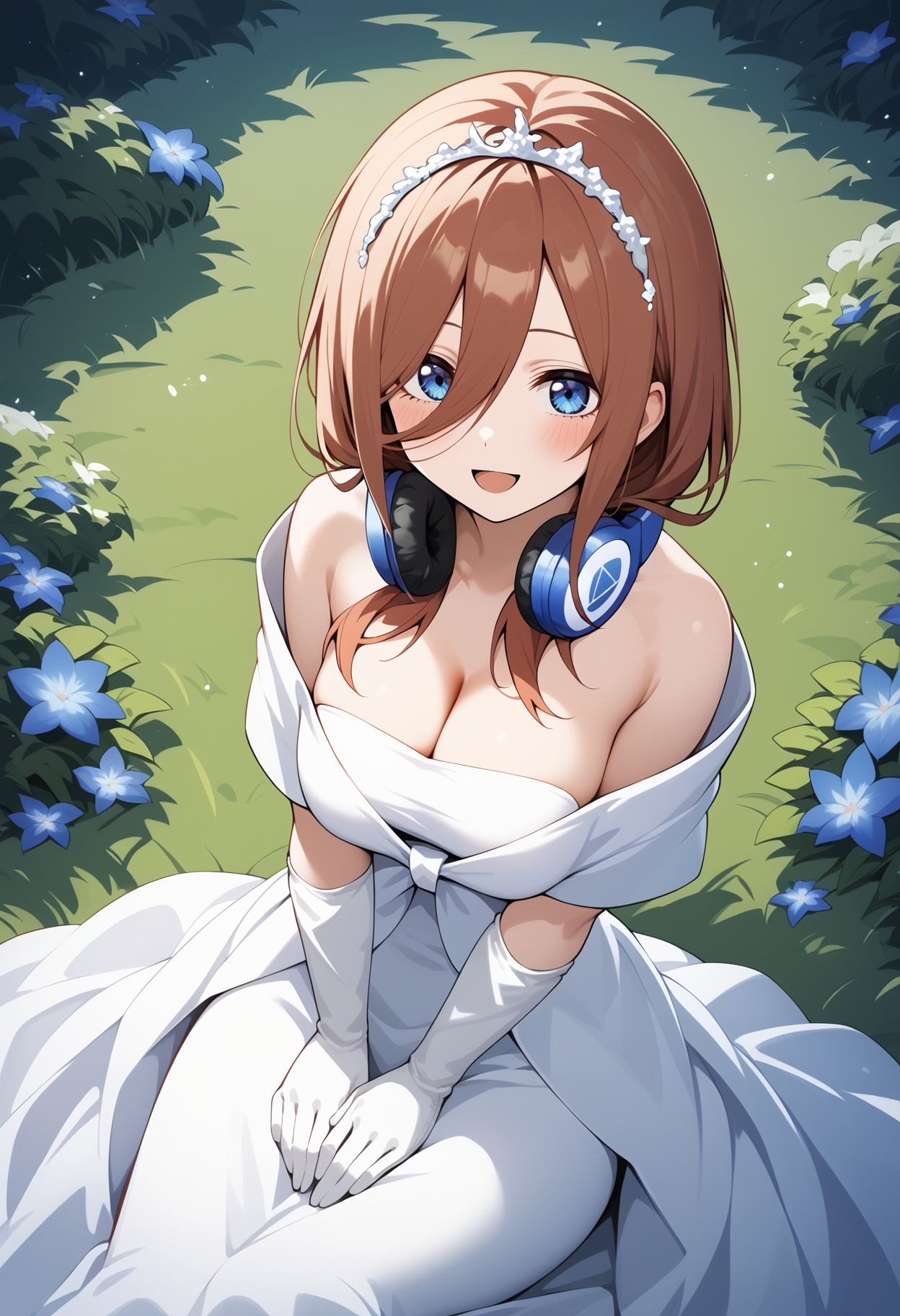 outfit3aamiku, long hair, brown hair, tiara, blue eyes, headphones, headphones around neck, breasts, off shoulder, cleavage, wedding dress, white dress, elbow gloves, white gloves