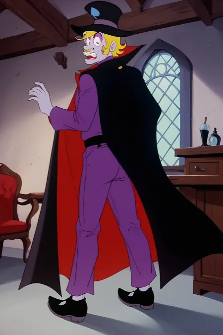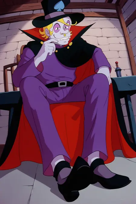 ➜ ChouMMXL, グレー肌, 色付き肌, 紫色のアイシャドウ, 黒目, 黄色の髪, 短髪, 黄色の口ひげ, 黒い高帽, 胸筋, 黒いマント, 紫色のシャツ, 長袖, ベルト, 紫色のズボン, 黒い靴