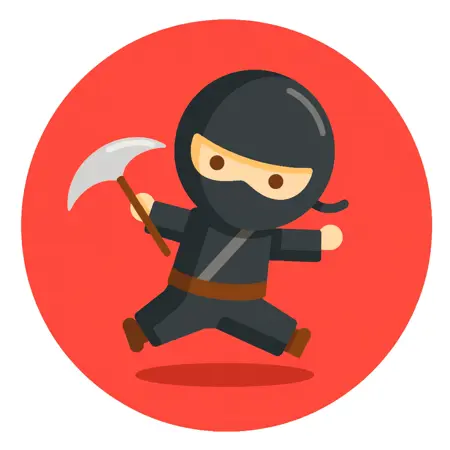 「鮮やかな赤色の背景に、黒いマスクを着た小さなニンジャが空中でジャンプするアイコンのイラスト。ニンジャの目は集中して細められ、片手には輝く銀色の手裏剣を握っています。黒と赤のコントラストが、ダイナミックでアクション満載の印象を生み出します。」