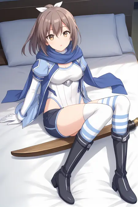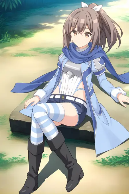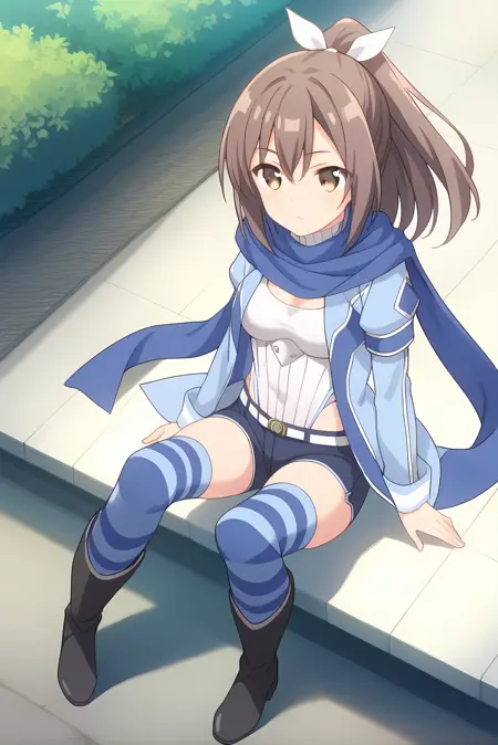 青いジャケット、白いレオタード、青いスカーフ、青いショートパンツ、縞模様のシンガーパンツ、黒い膝丈ブーツ