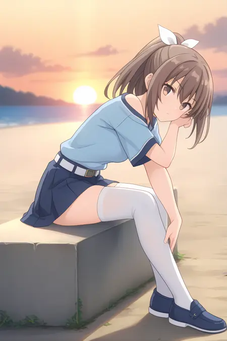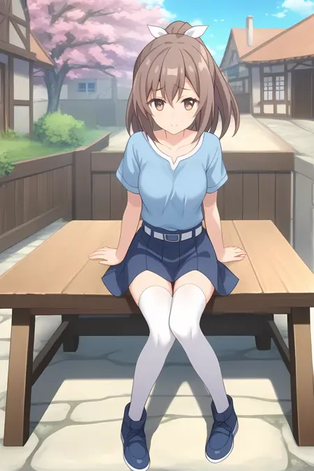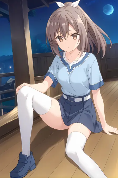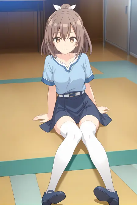 青いシャツ、青いスカート、白いスカートベルト、白いシンガーパンツ、青い靴