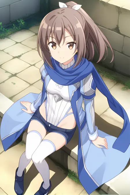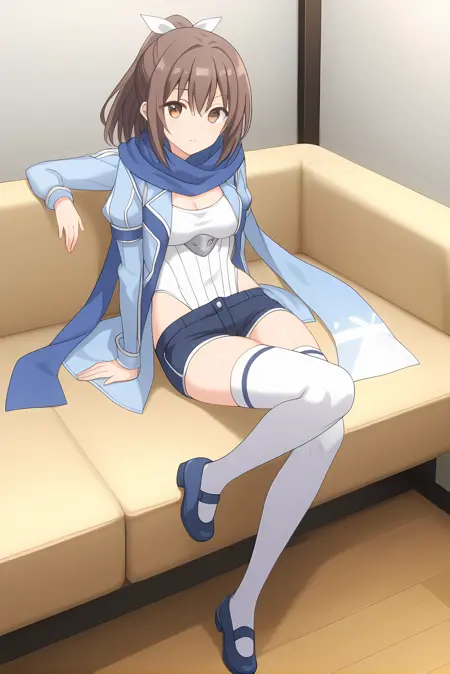 青いジャケット、白いレオタード、胸当て、青いスカーフ、青いショートパンツ、白いシンガーパンツ、青い靴