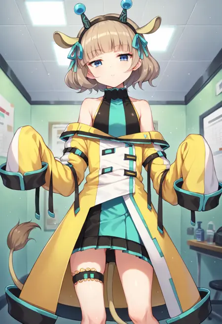 재킷, 노랑 재킷, 어깨 노출, 어깨 드러낸 복장, 드레스, 손가락을 넘어가는 소매, 긴 소매, 허벅지 스트랩, 기계적 팔,