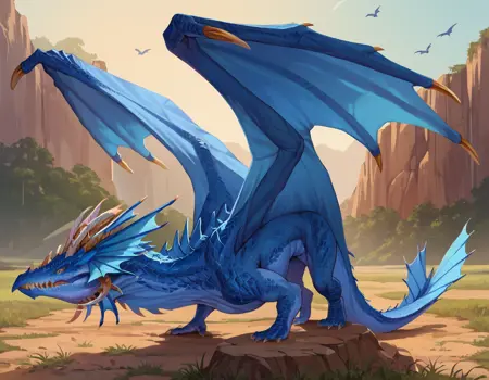 TrueDragon, blue scales, dragon wings, yellow eyes, horns,