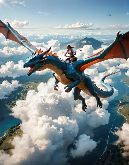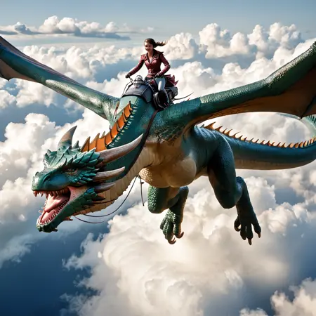 A simple prompt such as " a woman riding a dragon" will give you pretty good results. You can get pretty creative with the type of Dragon you want, and I did caption, medium, large, and huge dragon types. Adding things like "flying","clouds", "motion" helps to capture mid-flight scenes. You can also have multiple riders.