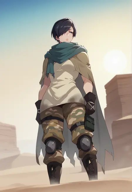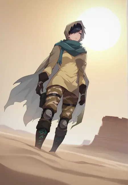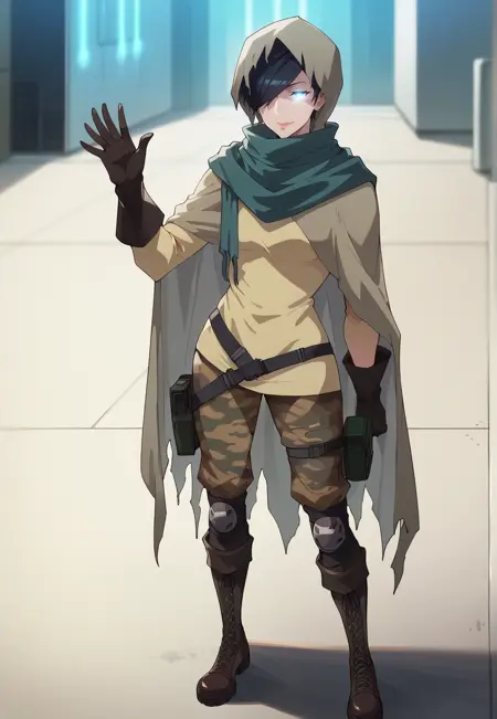 緑のスカーフ、フード、フード付きのマント、マント、フードをかぶる、破れた服、黒い手袋、長袖、マント、カモフラージュのズボン、シャツ、ベルト、太ももストラップ、クロスラッシングの靴、膝上ブーツ、ホルスター