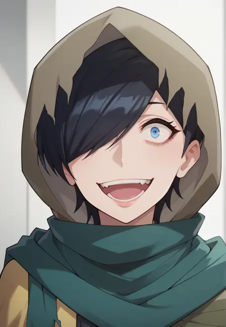 黒髪、短髪、片方の目に髪がかかる、青い目、中程度の胸