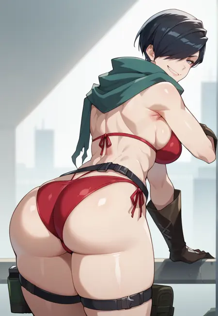 胸元、赤いビキニ、黒い手袋、緑のスカーフ、ベルト、太ももストラップ、クロスラッシングの靴、膝上ブーツ、ホルスター