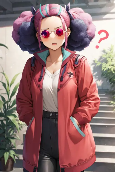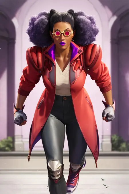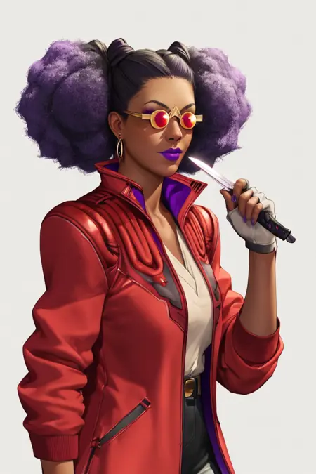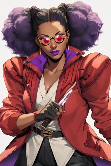 트리거 단어: BazzConcord, 아프로, 검은 피부, 빨간 재킷, 선글라스, 보라색 머리, 귀걸이, 보라색 입술, 검은 머리, 장갑, 이톤 머리,