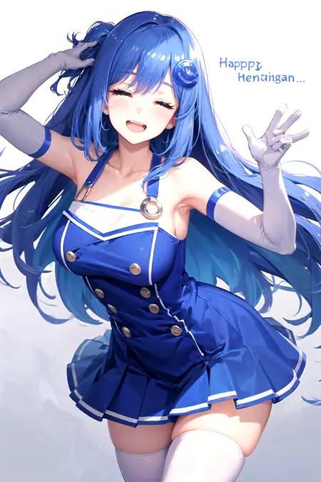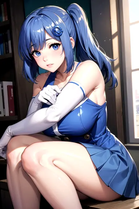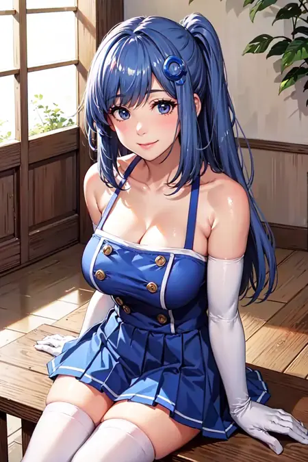 긴 머리카락, 파란 머리카락, 머리 장식, 머리핀, 큰 가슴, 허리까지 드러난 어깨, 파란 눈, 흰 장갑, 팔꿈치 장갑, 옆 번아웃 머리카락, 흰 무릎까지 오는 양말, 파란 드레스, 주름 치마, 레오타드