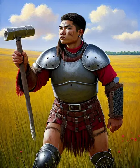 The trained words are illustration for male characters and anime for female (reccomended, else the AI could try to convert the images to unknown styles) - as for the trained classes we have mainly warrior, but also wizard, cleric, golem, dragon. The shield tag also works if you need. (Many more could work). I reccommend a weight lower than 1 - 0.7 worked in the examples.