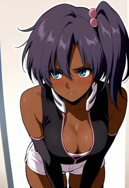 rachel ransom, detached sleeves, side ponytail, very dark skin, blue eyes, purple hair, 1girl, solo, small breasts